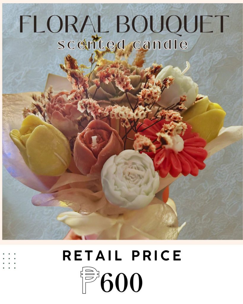 Floral Bouquet Scented Candle retails at ₱600 per bouquet. Candle can be customized in color, with a lead time of 2–3 days. Bulk orders are welcome.